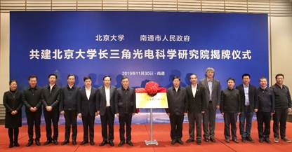 2019年11月30日下午,北京大学长三角光电科学研究院揭牌仪式在南通国际会议中心举行。北京大学党委书记邱水平,党委常委、副校长、教务长龚旗煌,物理学院院长高原宁,南通市委书记、市人大常委会主任陆志鹏,南通市委副书记、市长徐惠民出席。揭牌仪式由徐惠民主持。