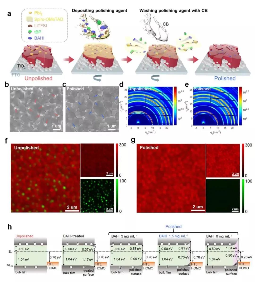 图1 (a)化学抛光过程示意图;(b,c)未抛光与抛光后薄膜的扫描电子显微镜图像;(d,e)未抛光与抛光后薄膜的掠入射广角X射线衍射二维图像;(f,g)未抛光与抛光后薄膜的激光扫描共聚焦荧光显微镜图像;(h)钙钛矿与空穴传输层界面的能级排列