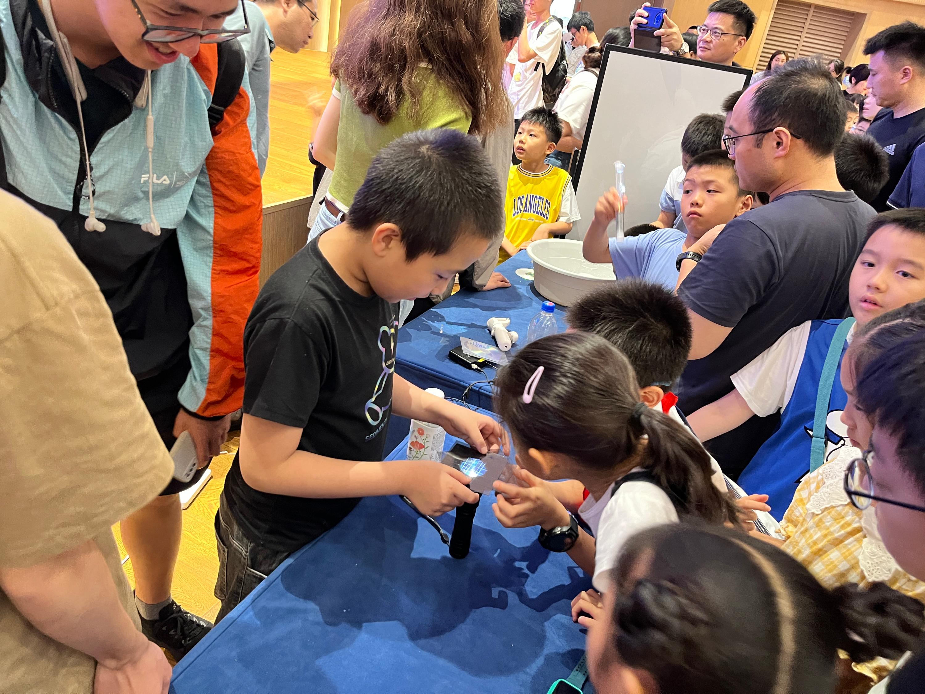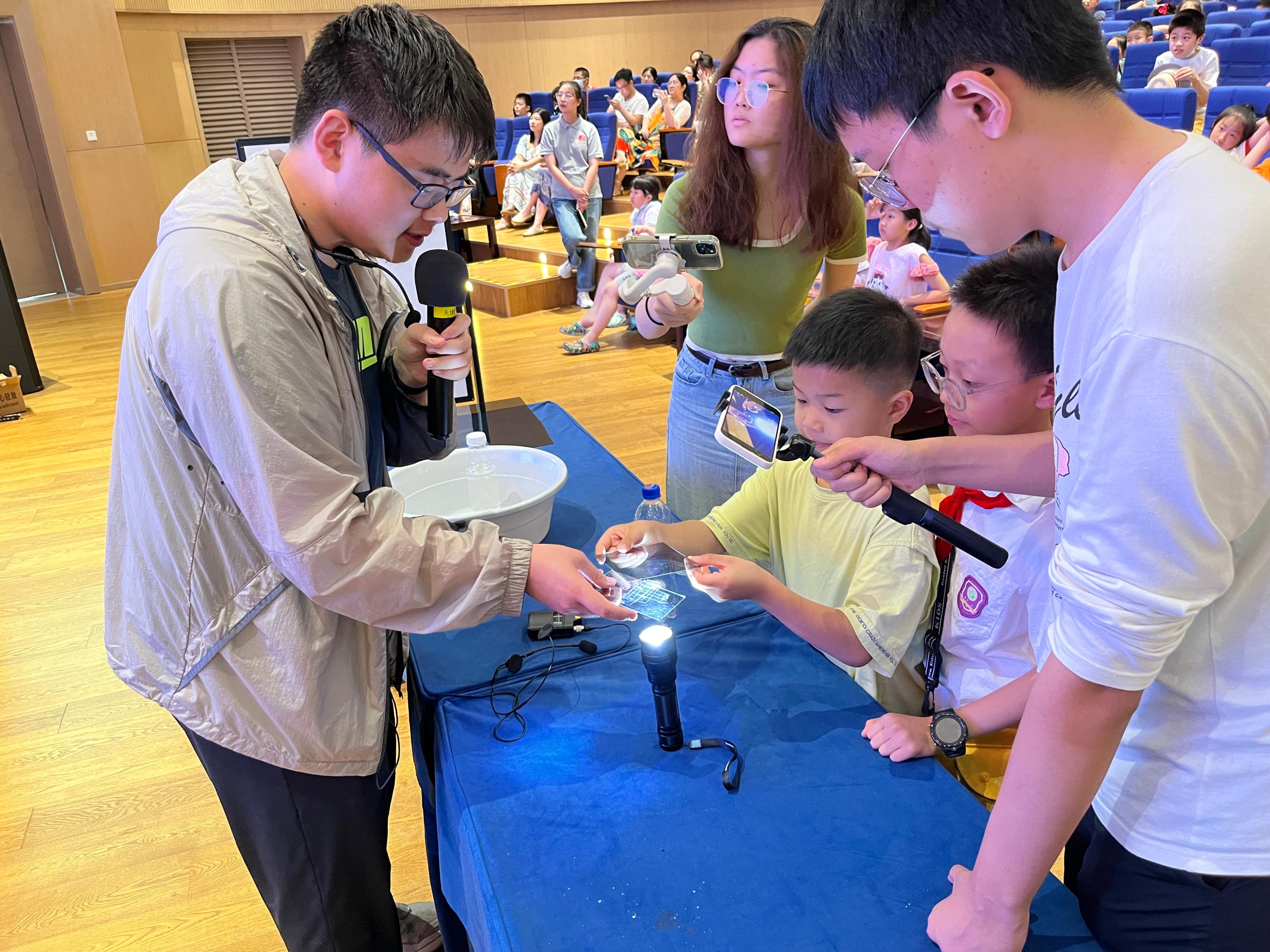 下午,实践团在创新区E5报告厅带来了一场面向南通中小学生的物理科普活动,吸引了四百多名中小学生及家长前来参加。实践团“演示家”们利用生活中常见的物品,呈现了力学、热学、电磁学和光学等方面的精彩实验。通过深入浅出的讲解,结合一个个互动性极强的小实验,一个半小时的活动激发了孩子们对物理的兴趣,赢得阵阵掌声。7月10日,实践团还将赴如皋开展社会实践活动。