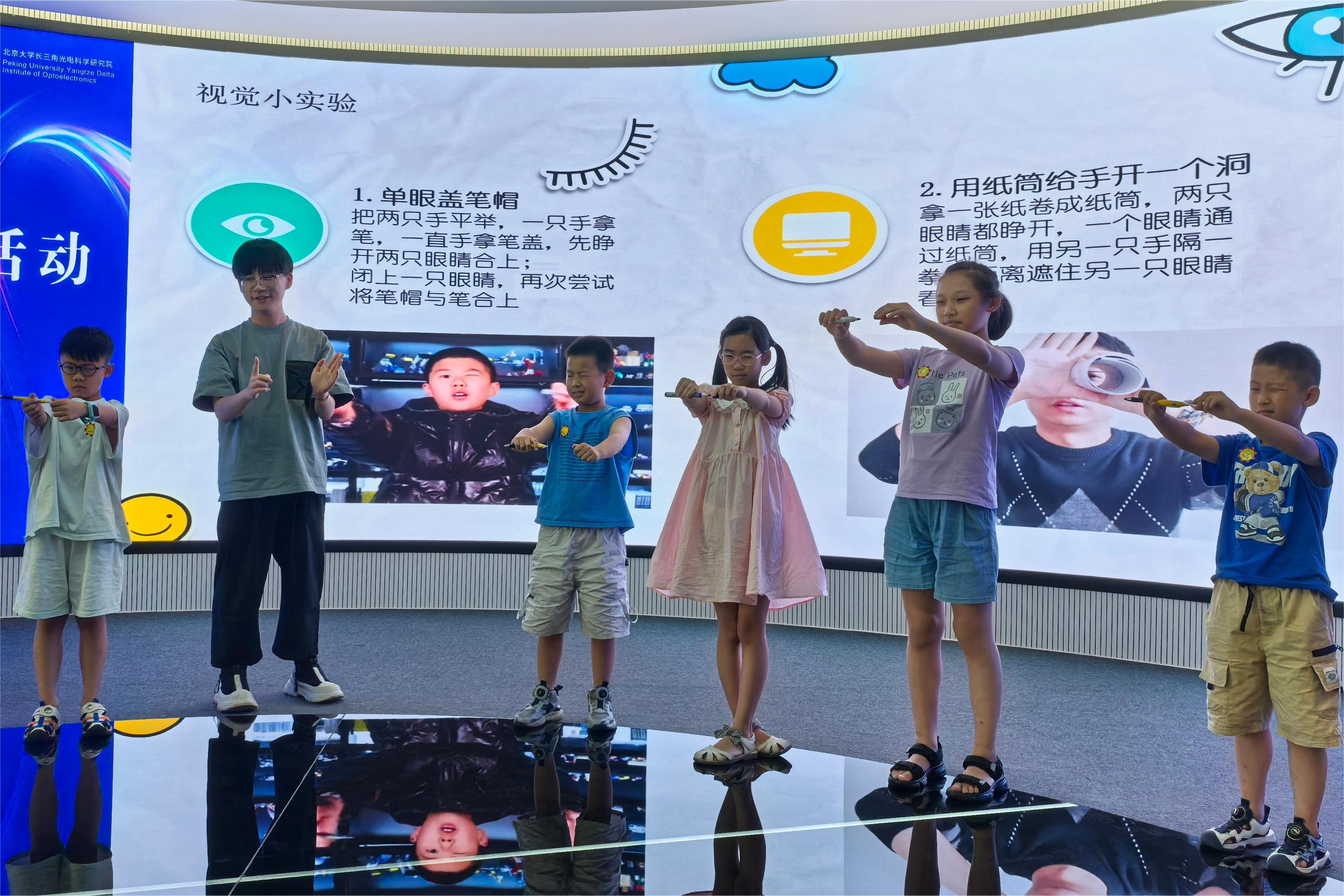 活动期间,来自北京大学物理学院的陈汀兰、蔡紫菁、张玄诣、徐艺轩等研究生们分别以“光与海洋”、“颜色的奥秘”、“隐形魔术·光的偏振密码”和“人眼的奥秘”为主题,运用浅显易懂的语言和直观生动的演示,引领孩子们穿梭于光与海洋的奇妙世界,从物理学的独特视角揭开色彩生成的神秘面纱,极大地激发了孩子们对光现象的好奇与探索欲。通过趣味横生的实验与深入浅出的讲解,不仅揭示了光的偏振现象如何编织出“隐形”的奇幻故事,还引导孩子们以全新的视角审视并敬畏起我们不可或缺的感知器官——眼睛。活动期间,孩子们仿佛置身于一场光与影交织的梦幻之旅,体验着科学带来的无限惊喜。
