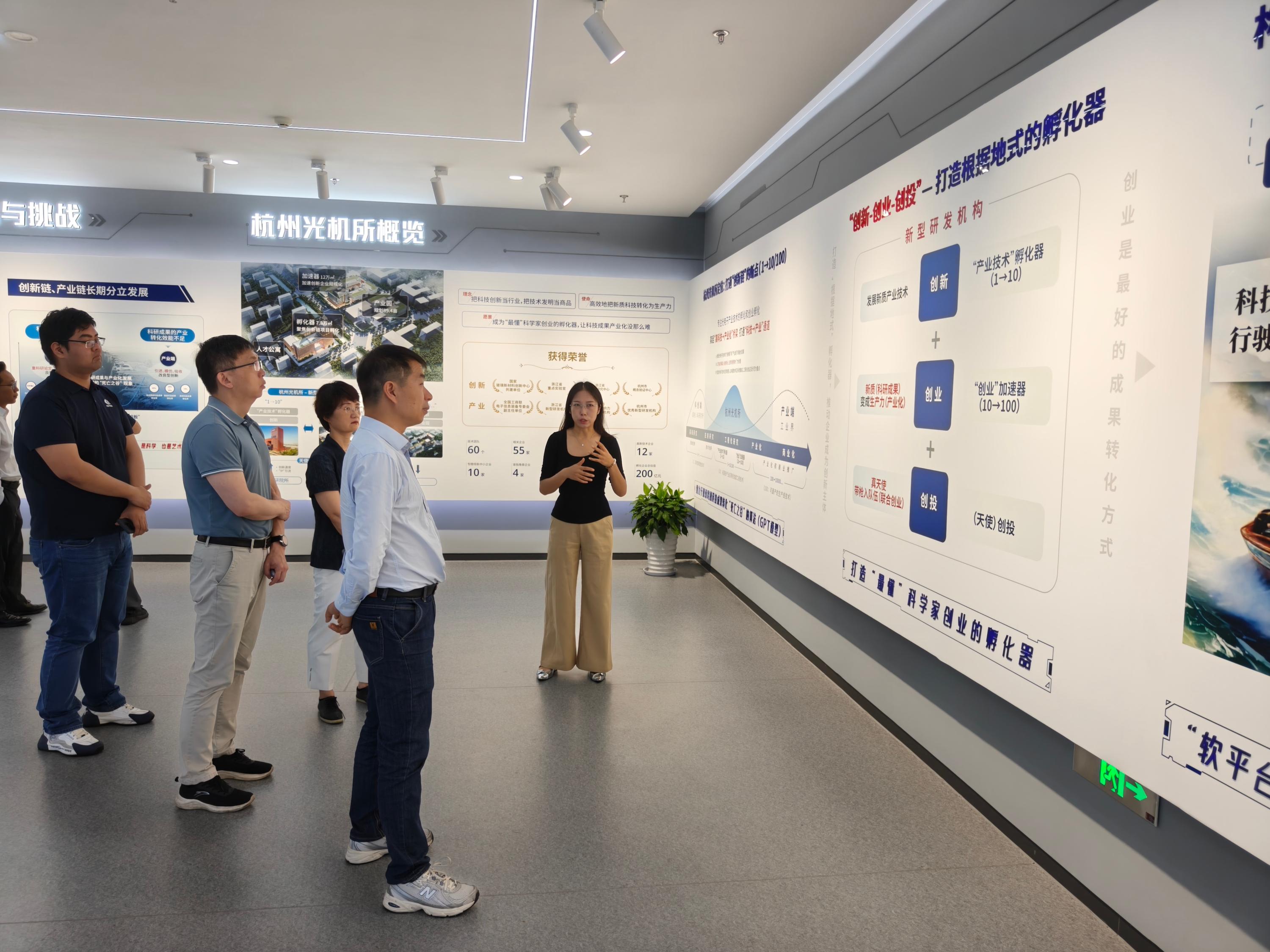 当天上午,研究院一行赴杭州光机所调研交流。在副所长赵虹霞的详尽介绍下,研究院重点了解了杭州光机所的发展脉络、“科研-转化-产业”全链条生态体系及其“最懂科学家”的孵化服务模式。会上,双方就杭州光机所近年来聚焦的重点领域及其开拓的“硬核”科技企业创新路径等展开了深入交流与探讨。双方互相分享学习先进管理经验,并强调此次调研交流为后续深化合作提供了契机,也为双方未来科技创新高地建设注入了新动能。
