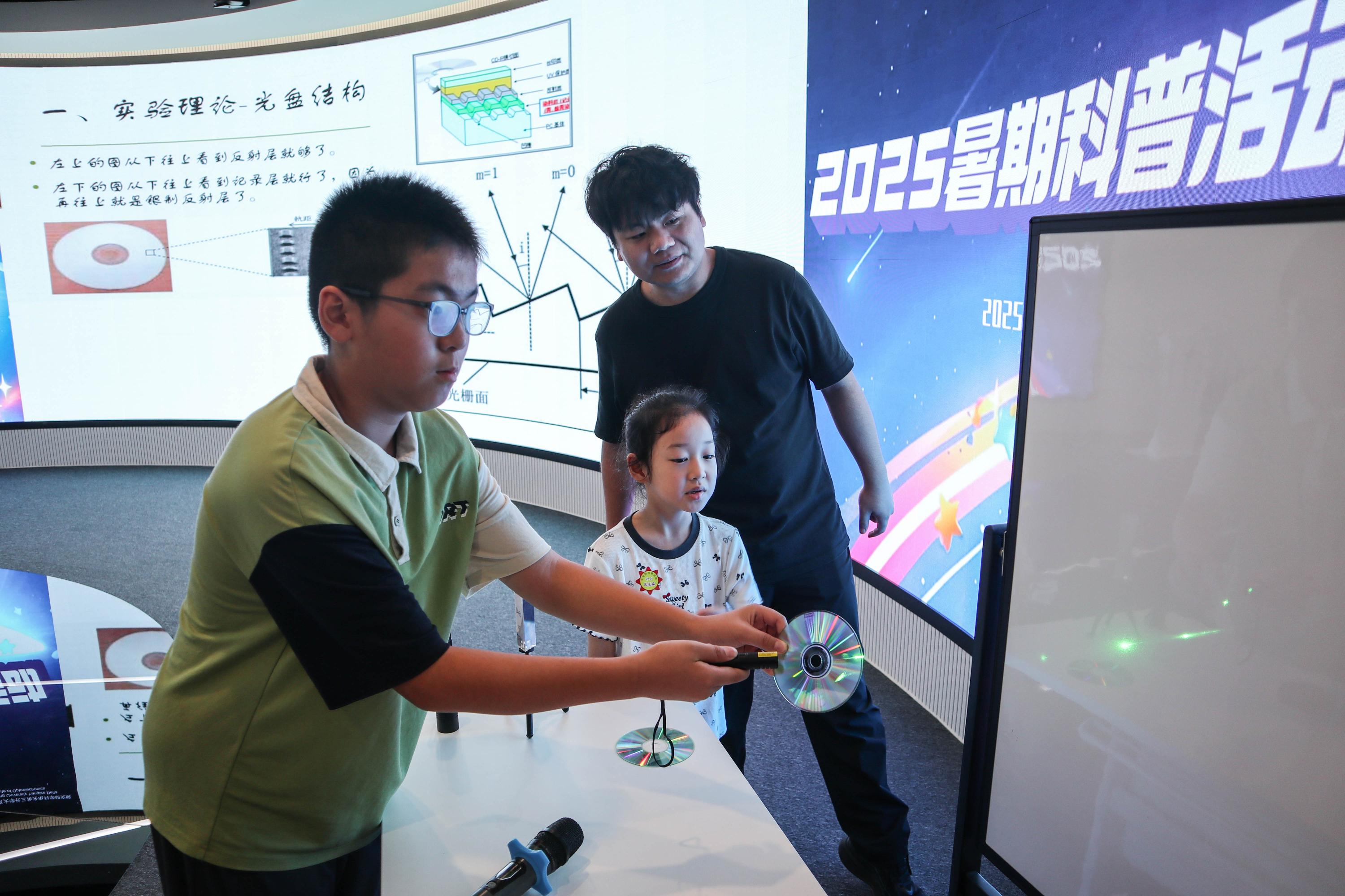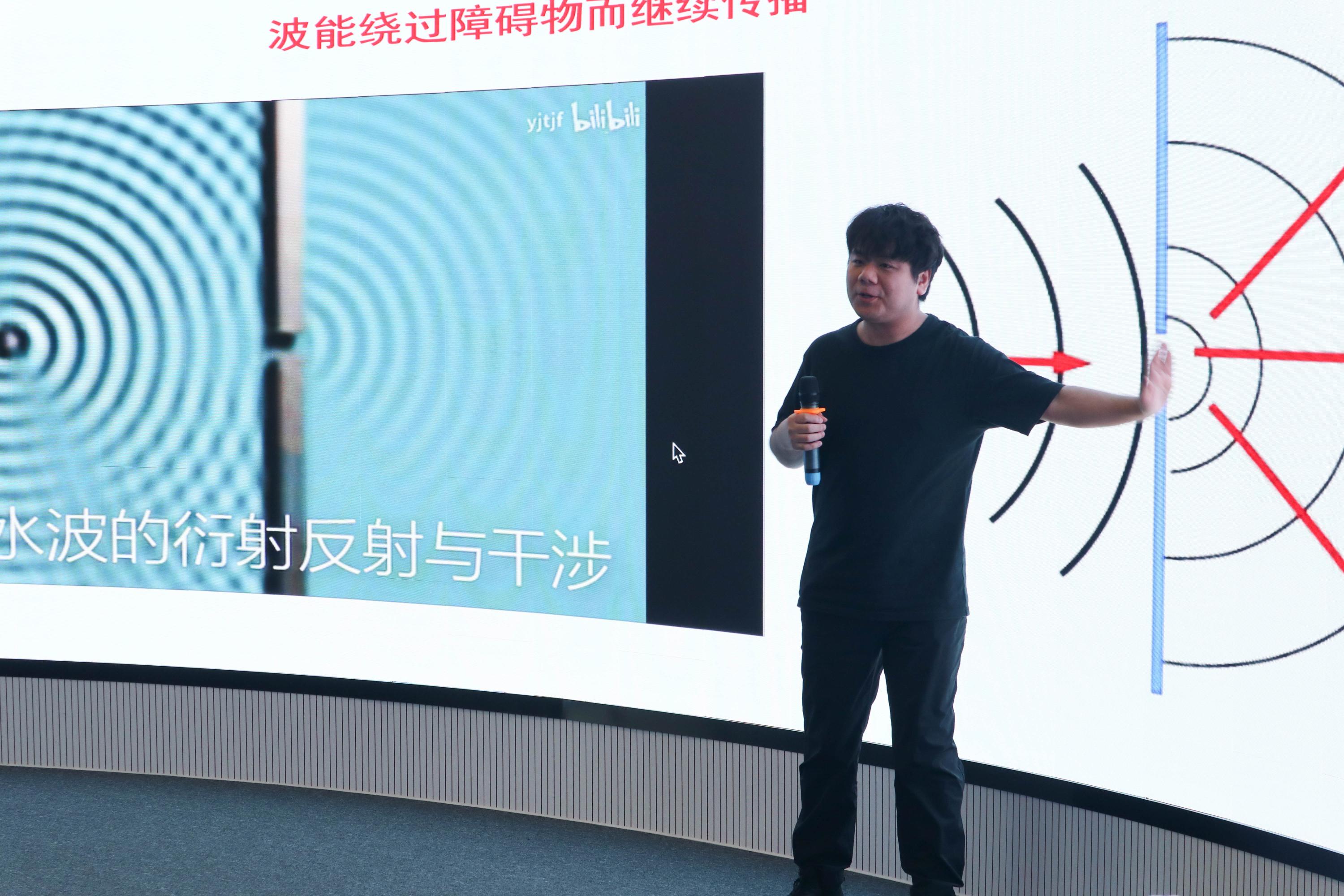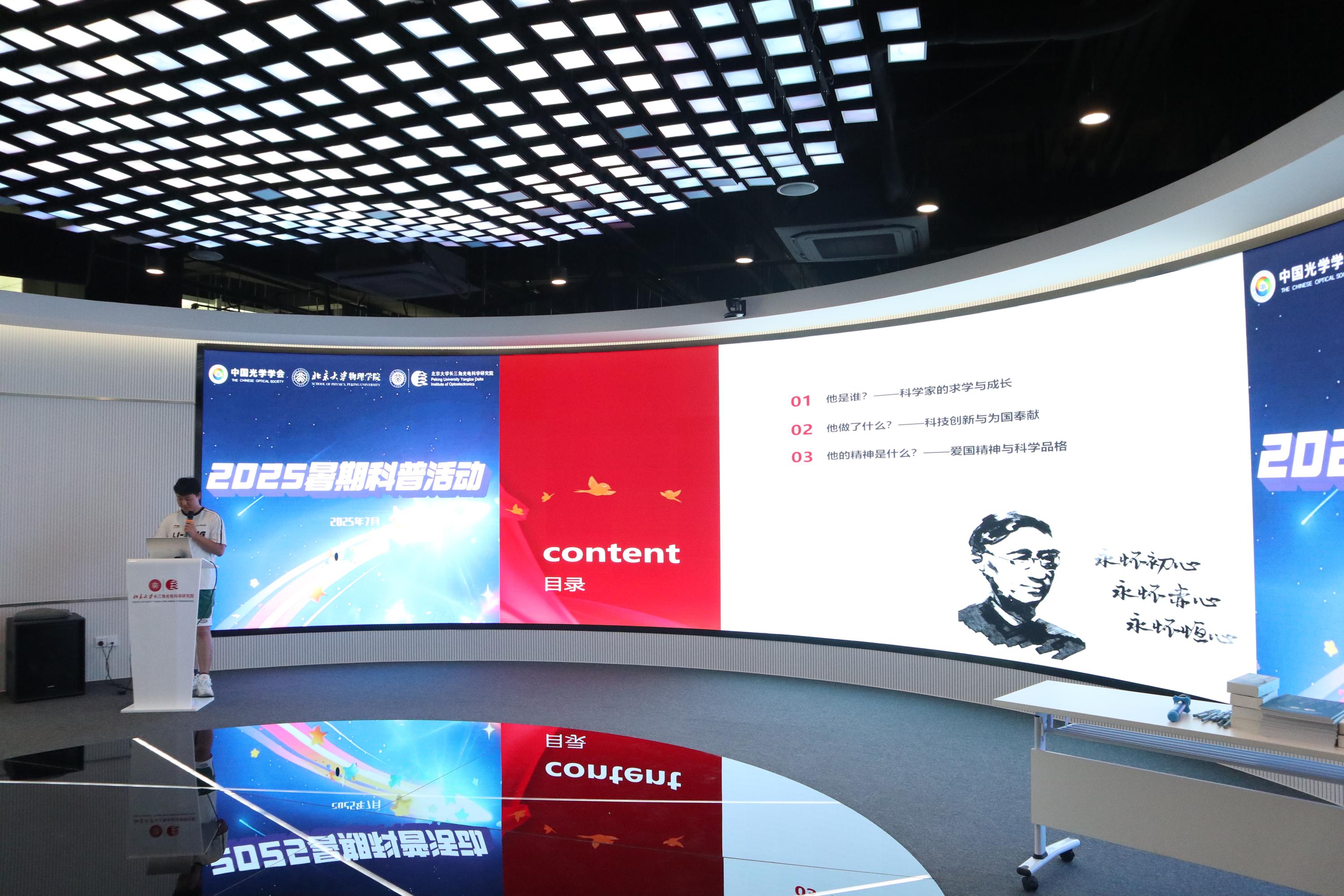 7月25日至26日,来自北京大学物理学院的博士后贾新宇,博士研究生孟祥瀚、游畅,以及专业硕士研究生周少锋分别带来精彩科普分享。孟祥瀚以《彩虹解密手册——色散》为题,用生活实例拆解光的色散原理,从牛顿的棱镜实验讲到现代显示技术,让抽象的光学概念化作看得见、摸得着的科学现象;周少峰在《永不熄灭的科学之光——两弹元勋郭永怀》中,用珍贵的历史照片与故事,讲述了郭永怀先生在极端艰苦的条件下,如何带着科研资料从国外归来,为"两弹一星"事业奉献一生的家国情怀;游畅的《激光的科学秘密》主题科普,生动解析激光的单色性、方向性原理,并展示了激光在工业制造、医疗健康等领域的神奇应用;贾新宇则在《光的"波浪舞"——干涉与衍射》中,借助水波干涉、光的衍射等实验演示,生动展现光的波动特性,让孩子们真切领略光的神奇之处。