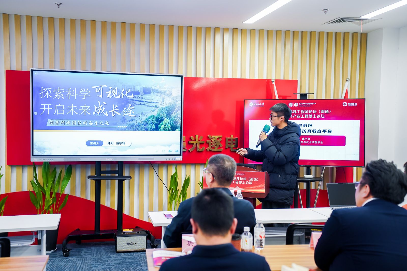 南通市人大常委会副主任、南通经济技术开发区党工委书记、南通创新区党工委常务副书记保德林,南通市第十五届人大常委会副主任、南通市新兴产业科创发展促进会会长陈俊,南通市科技局副局长吴卫东等地方领导,北京大学研究生院副院长蔡晖,北京大学物理学院教授、人工微结构和介观物理全国重点实验室主任、北京大学长三角光电科学研究院院长刘运全,北京大学物理学院教授、党委副书记李焱,北京大学物理学院教授、党委副书记穆良柱,北京大学物理学院教授级高级工程师、北京大学长三角光电科学研究院执行院长杨宏等校方领导、地方部门代表和嘉宾出席开幕式。本次论坛还汇聚了来自学术界、产业界与投资界的专家,以及四十余位北京大学工程博士生与工程硕士生等近两百位嘉宾,共话卓越工程师培养与新兴产业技术创新,共筑校地协同、产学研用深度融合的发展新格局。