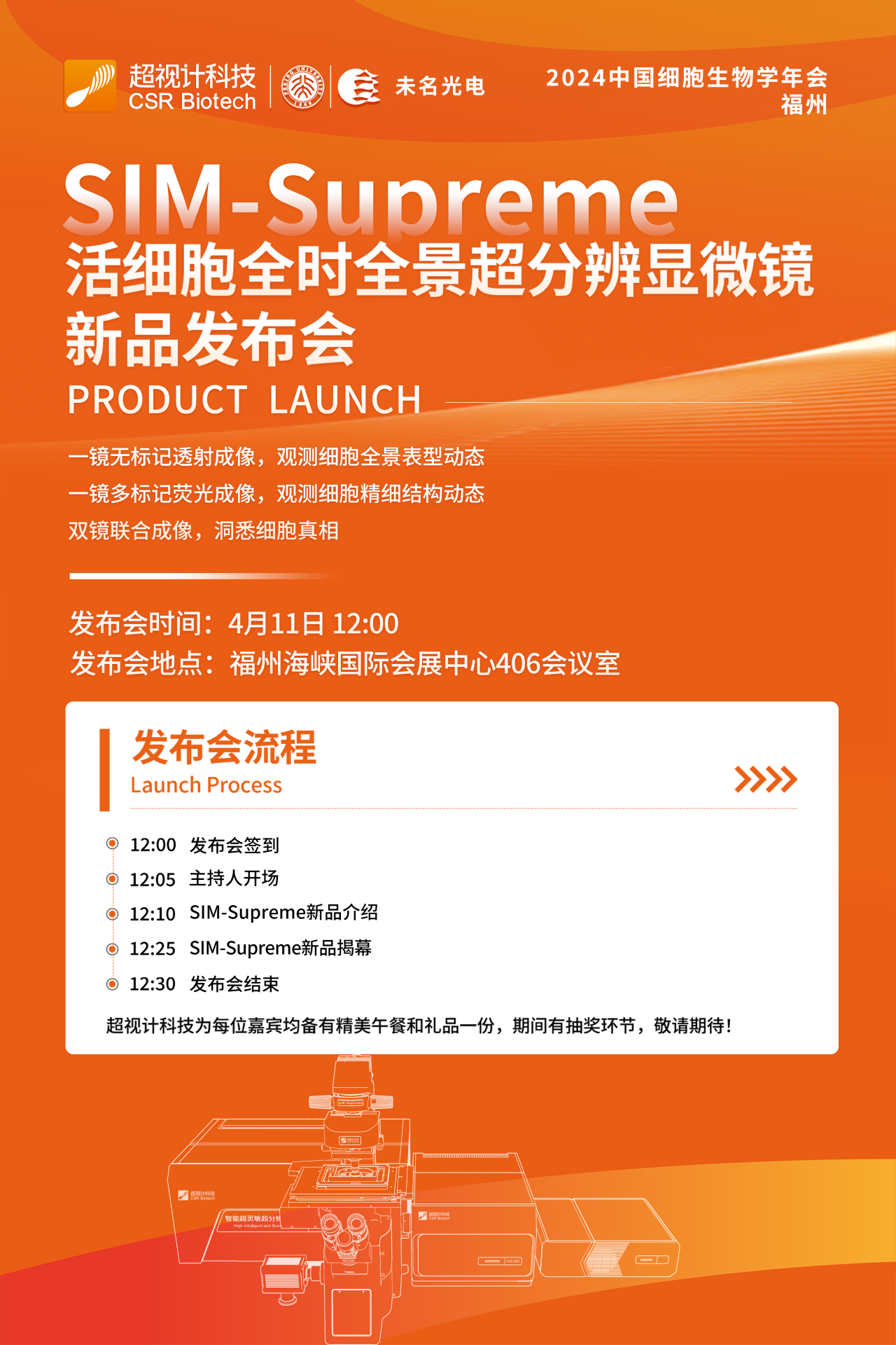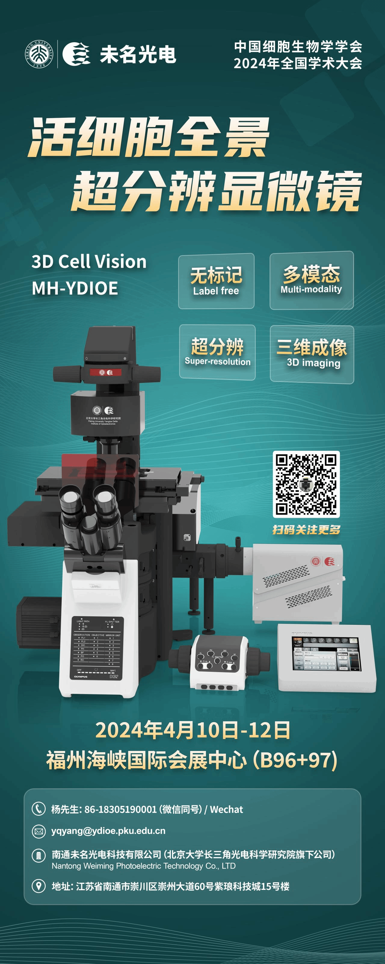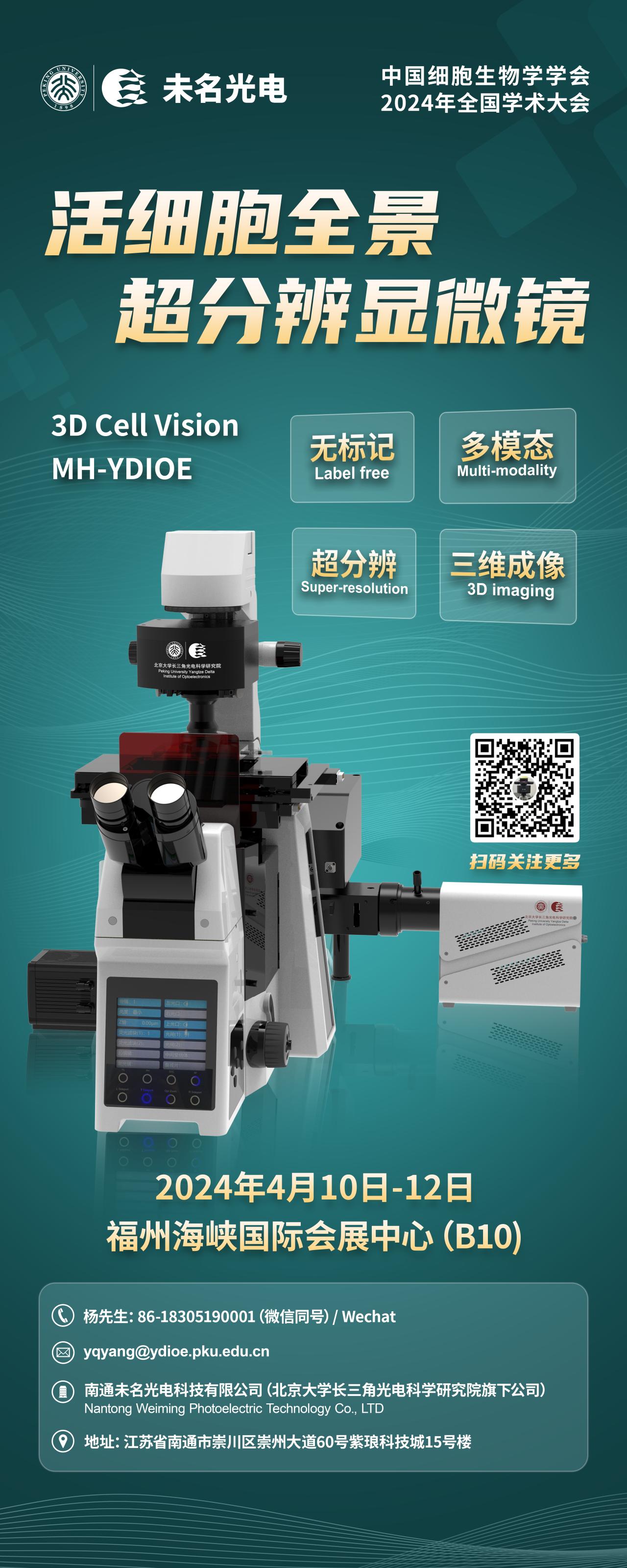 为促进我国细胞生物学领域研究人员的交流与合作,推动中国细胞生物学学科的发展,“中国细胞生物学学会2024年全国学术大会·福州”将于2024年4月8-12日在福建省福州市举行。南通未名光电科技有限公司将带来活细胞无标记超分辨全景显微成像解决方案,欢迎莅临B10、B96+97展位。同时,未名光电将与超视计合作同步推出SIM-ODT双模态超分辨显微镜(活细胞全时全景超分辨显微镜、SIM-Supreme)。