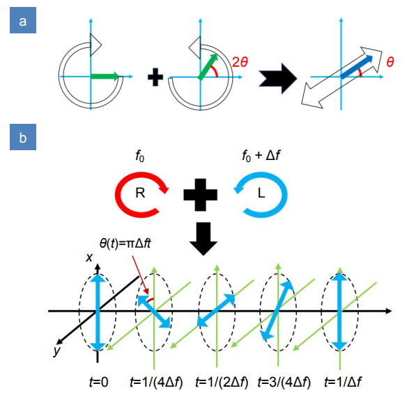 作为光学微操纵领域的重要研究方向之一,光致微纳颗粒旋转对于光束的偏振态演化过程高度敏感,偏振的跳变会对颗粒的旋转状态产生巨大的影响,因此开发一种高速、连续、无跳变的偏振调制技术对于推动光学微操纵领域的发展具有重要意义。光学外差法通常是指将两个频率具有微小差异并且偏振态一致的相干光束叠加,产生低频强度拍频的过程。该方法可以将微弱的直流信号转化为交流信号,进而利用锁相放大器等器件提取微弱信号,因此广泛应用于光传感领域。此外,光学外差法还可以使两束偏振态正交的光束产生类似的“偏振拍频”的低频偏振调制现象,这就为实现偏振态的无跳变的连续调控提供了一种新思路。