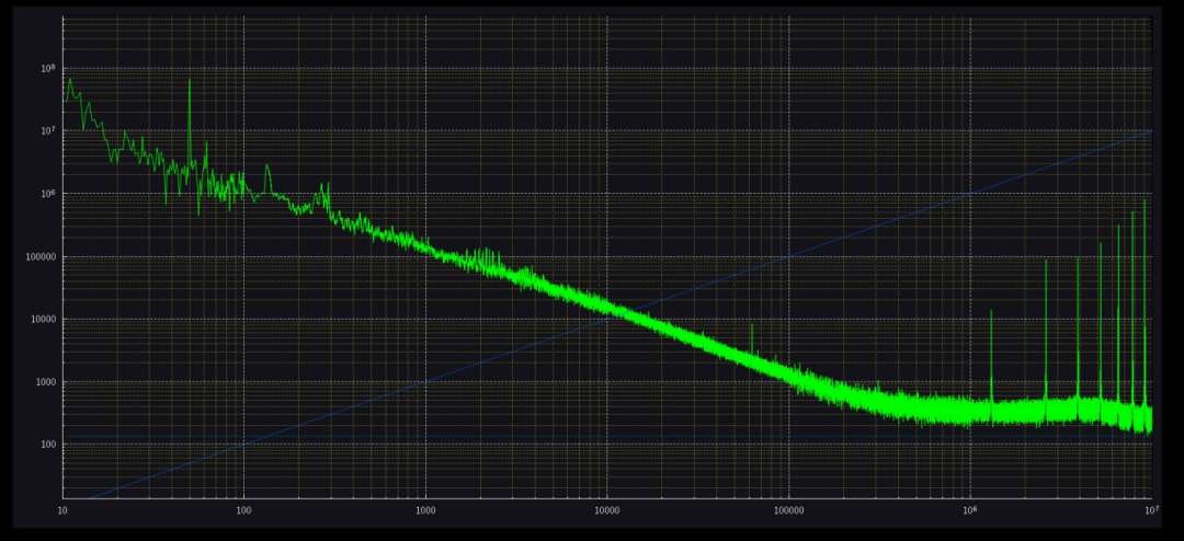 附图为同一激光器在两个不同锁定模式下的频率噪声对比。黄线的白噪声极限低于蓝线,说明该模式的损耗更小。而在略高于10 kHz处两个模式的噪声出现重叠,这些噪声很可能来自同一激光器共用的电学部分;同样在略高于1 MHz处有一簇重合的噪声峰,结合频段和线型判断,可能源于激光腔内的非线性过程。