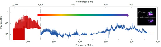 图2.实验实现的覆盖450—2000 nm、跨越两个倍频程展宽的微腔光梳光谱图。插图:显微镜直接观测到的多色可见光出射