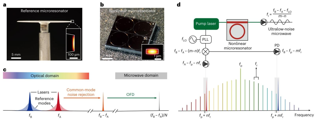 团队研究了一种基于微谐振器的光频分系统,该系统将集成氮化硅(Si₃N₄)微谐振器中形成的孤子微梳稳定在氟化镁(MgF₂)微谐振器的两个激光器上,并采用“两点锁定”的方案来进行光学频率分频。