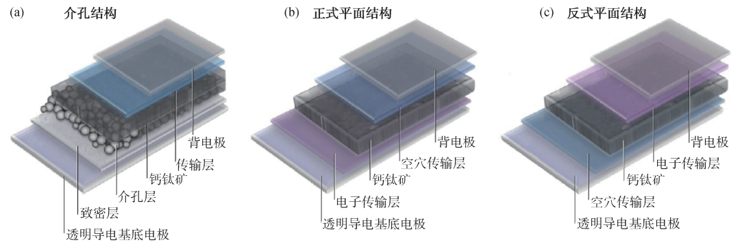 (1)介孔结构:介孔结构钙钛矿太阳能电池以正式介孔结构为主,其器件结构自下而上为:透明导电基底电极、致密金属氧化物层连同介孔金属氧化物层(作为电子传输层,常为TiO2)、钙钛矿吸光层、空穴传输层、金属背电极(图4(a))。在这种结构中,致密TiO2作为空穴阻挡层,可使氟掺杂氧化锡(FTO)与TiO2之间形成肖特基势垒,阻止空穴由钙钛矿吸光层向FTO层的传输。除TiO2之外,Henry J. Snaith等[13]曾用介孔Al2O3代替TiO2,Al2O3不参与电荷传输,仅起到支架作用,电荷可直接通过钙钛矿向两边进行传输。Hongwei Han等[21]于2013年开发出一种基于廉价碳电极的可印刷无空穴传输材料介观钙钛矿太阳能电池,具有多层介孔金属氧化物结构(TiO2和ZrO2)特征,经过十年的努力,目前可达到22%的光电转换效率[22]。此外,Liyuan Han等[23]研究了反式介孔结构,将致密氧化镍(NiOx)与介孔Al2O3结构相结合作为空穴传输层,制备并验证了相应结构电池的可行性。经过十余年的发展,目前介孔结构钙钛矿太阳能电池的最高光电转换效率可达26.52%(认证值为26.31%)[24],这也是我们研究团队的最新研究进展。