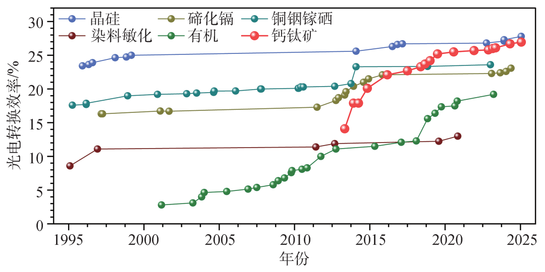 图3 不同种类太阳能电池效率进展图(图中数据摘自美国国家可再生能源实验室发布的《太阳能电池效率进展图》)[15]