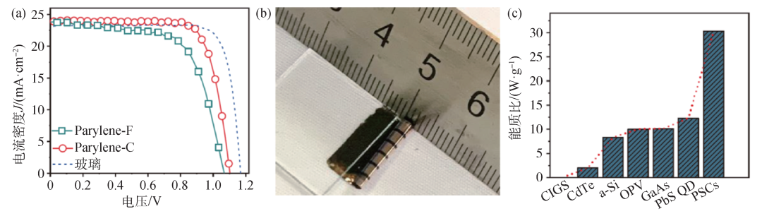 图7 (a)在超轻柔基底上制备的钙钛矿电池的J—V特性曲线;(b)柔性钙钛矿电池弯折时(曲率半径为1 mm)的光学照片;(c)基于Parylene的超轻柔电池(PSCs)与其他高能质比太阳能电池的比较[76]